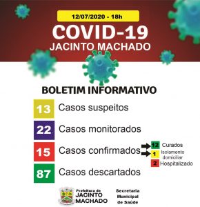Neste domingo, 12, foi confirmado mais um caso de covid-19 em Jacinto Machado. O idoso de 72 anos, sem histórico de viagens, está hospitalizado. Ele é o 15º caso de coronavírus na cidade.