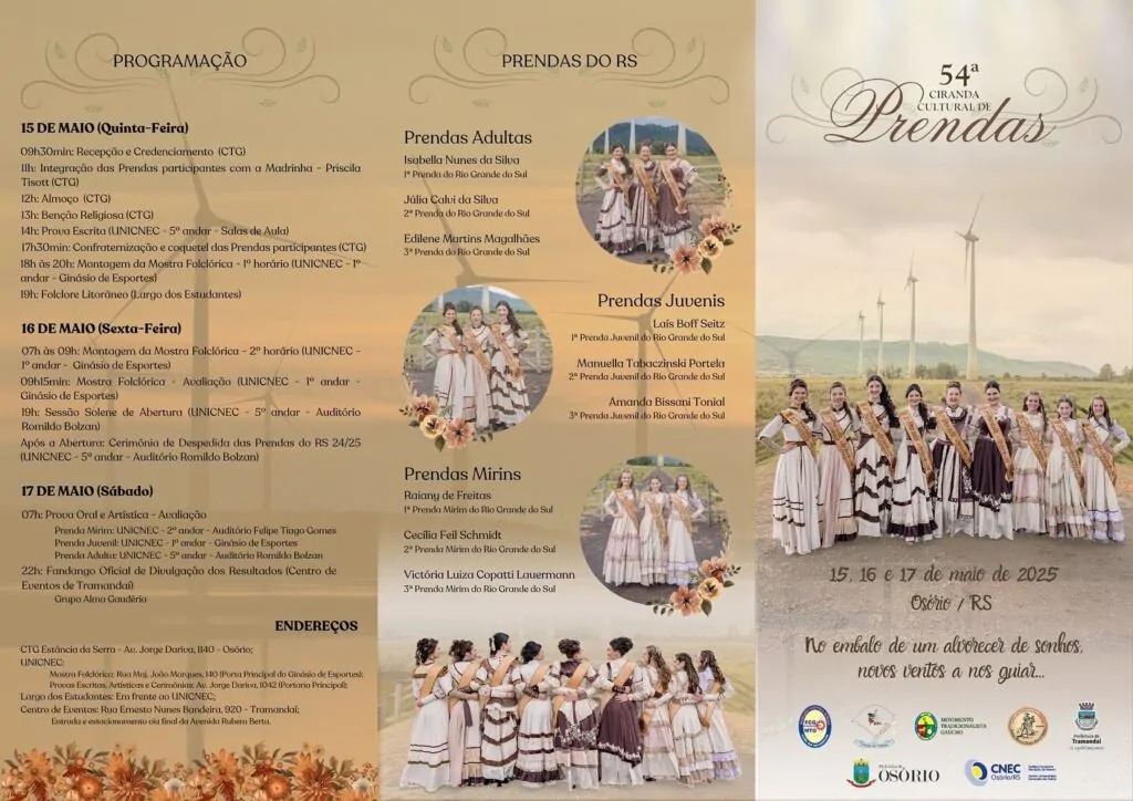 De acordo com a prefeitura da cidade, Osório será será sede da 54ª Ciranda Cultural de Prendas do Rio Grande do Sul, que acontece de 15 a 17 de maio.