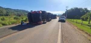 Carreta Rodotrem tomba na SC 449 em Jacinto Machado