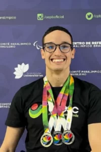 O nadador paratleta João Paulo Gregorini fez bonito representando a Unesc nas Paralimpíadas Universitárias — Etapa Sul-Sudeste, realizadas na cidade de São Paulo nessa quinta e sexta-feira (25 e 26/05), no Centro de Treinamento Paralímpico. O acadêmico do curso de Direito da Unesc conquistou um lugar no pódio nas três provas em que competiu, com duas medalhas de ouro e uma de prata.