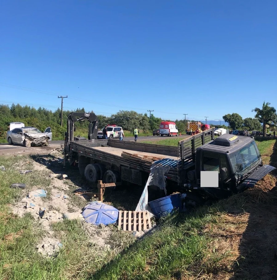 Na manhã desta segunda-feira (28), um grave acidente de trânsito foi registrado na SC-285, na comunidade de Soares, em Araranguá. A colisão envolveu três veículos: um Ford Fusion, uma Fiorino e um caminhão.
