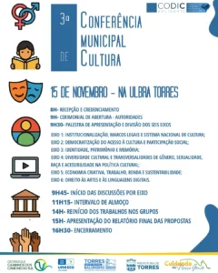 Com o objetivo de promover a escuta dos fazedores de cultura e fomentar o debate sobre as políticas públicas voltadas ao setor, a Prefeitura Municipal de Torres, por meio da Secretaria da Cultura e do Esporte e com o apoio do Conselho Municipal de Política Cultural, realizará a Conferência Municipal de Cultura no dia 15 de novembro, a partir das 9h, na ULBRA Campus Torres.