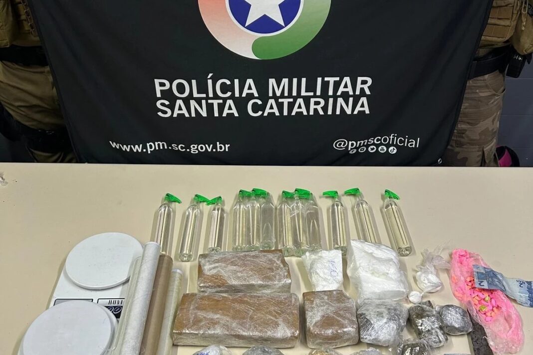 Uma operação da Polícia Militar (PM) resultou na apreensão de uma grande quantidade de drogas, munições e balanças de precisão, na noite desta terça-feira (13), na rodovia Arquimedes Naspolini, no bairro Mina do Toco, em Criciúma. Dois suspeitos foram presos por tráfico de drogas e um terceiro conseguiu fugir para uma área de mata.