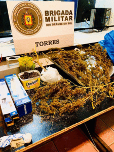 Policiais militares de Torres estavam realizando apoio a uma guarnição da PATRAM, após denúncias de mãos tratos a animais, quando flagraram no local uma espécie de laboratório clandestino de cultivo e preparo de drogas. Durante revista, foram encontrados 13 pés de maconha já em processo de secagem, um reator de luz para a secagem do material, um saco de adubo, uma porção de maconha e três potes com plantas de maconha.