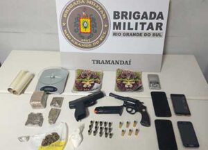 Foi visualizado e abordado um homem de 38 anos, e com ele foi localizada uma pistola calibre .40, 15 munições do mesmo calibre, um revólver calibre .38, seis munições do mesmo calibre, uma porção de cocaína, seis porções de maconha, quatro telefones celulares, duas balanças de precisão e adesivos com a descrição “Tropa do Imbé”.