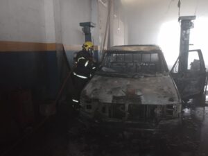A guarnição do ABTR-121 foi acionada via COBOM para um incêndio em edificação. No local foi constatado tratar-se de incêndio em veiculo no interior de uma oficina mecânica. O incêndio estava concentrado na parte frontal do veiculo já sendo efetuado o primeiro combate com o uso de extintor pelo funcionário da mecânica.