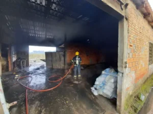 Chegando ao local, foi confirmado o sinistro e iniciado o dimensionamento e gerenciamento das chamas. Foi feito o combate do fogo de forma ofensiva para que o incêndio não alcançasse outras áreas do galpão onde estava a estufa. Dos 210 metros quadrados do galpão, aproximadamente 150 foram atingidos. Foi isolado a área e informado ao proprietário que será realizado inspeção no local.