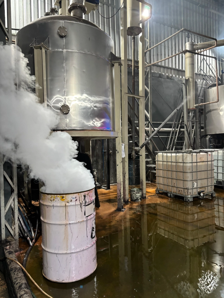 Ao chegar ao local, a equipe constatou que o perigo estava concentrado em tambores de 200 litros, sendo que um deles já havia rompido. Diante do risco, a guarnição isolou a área e iniciou o resfriamento dos recipientes superaquecidos, aguardando até que atingissem condições seguras para manuseio.