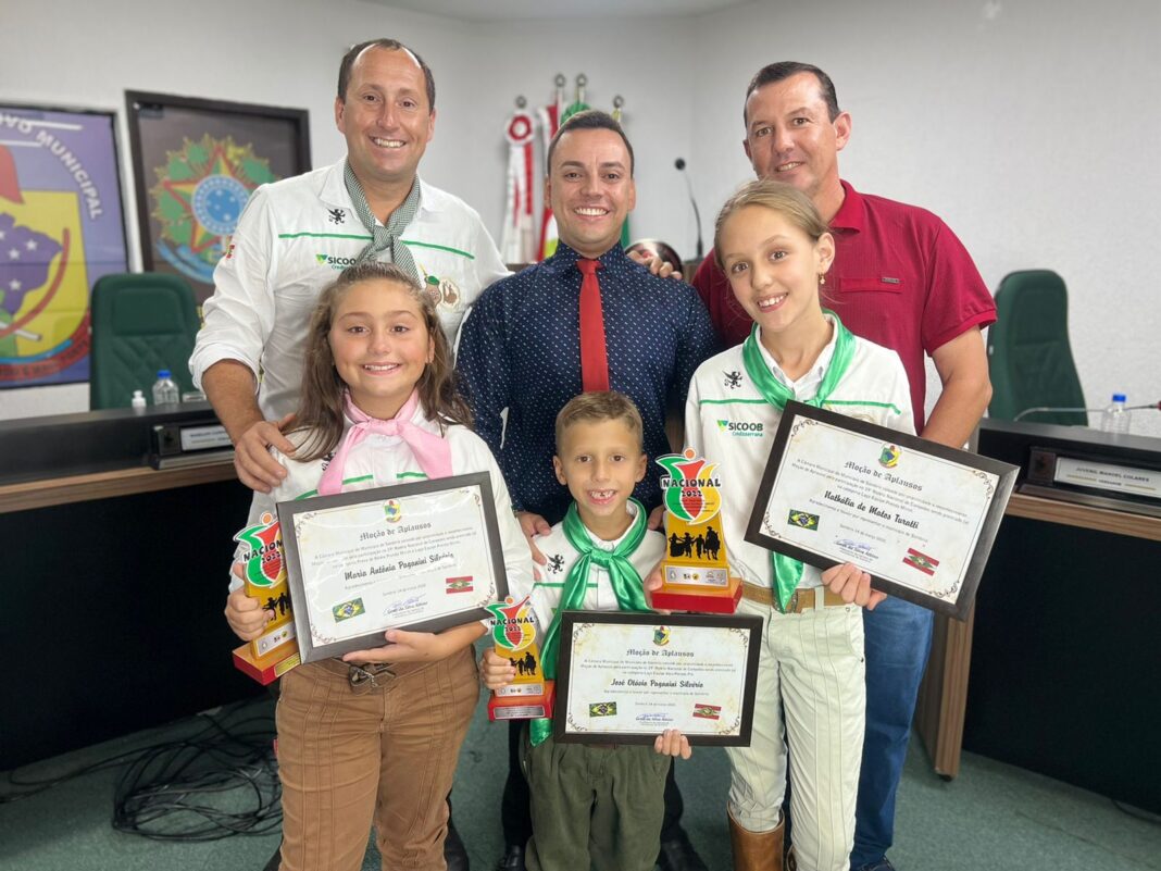 Em sessão realizada nesta segunda-feira (14) o presidente da Câmara Municipal de Sombrio, vereador Gean Albino, no uso de suas atribuições, concedeu Moção de Reconhecimento e Aplausos a Maria Antônia Paganini Silvério, José Otávio Paganini Silvério e Natália matos Turatti pela participação na 19ª edição do Rodeio Nacional de Campeões, realizado no CTG Pedro Raimundo, em Criciúma.