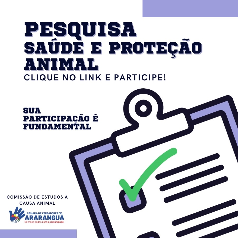 A Comissão de Estudos à Causa Animal da Câmara de Vereadores de Araranguá iniciou a pesquisa ‘Saúde e Proteção Animal’ em seu site oficial. O objetivo é ouvir a população sobre a causa animal no município, por meio de um questionário. As respostas serão mantidas em sigilo, e as informações coletadas servirão para fundamentar e orientar as ações da comissão.