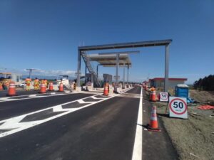 Um caminhão carregado com toras de madeira, com placas de Sombrio, colidiu nesta madrugada de sábado (20) em uma das cabines de pedágio instaladas pela CCR ViaCosteira na BR-101, em São João do Sul.