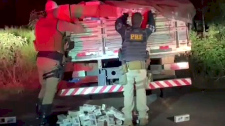 Aproximadamente 75 mil maços de cigarros contrabandeados do Paraguai foram apreendidos. A carga estava em um caminhão, que utilizava placas de uma camionete.