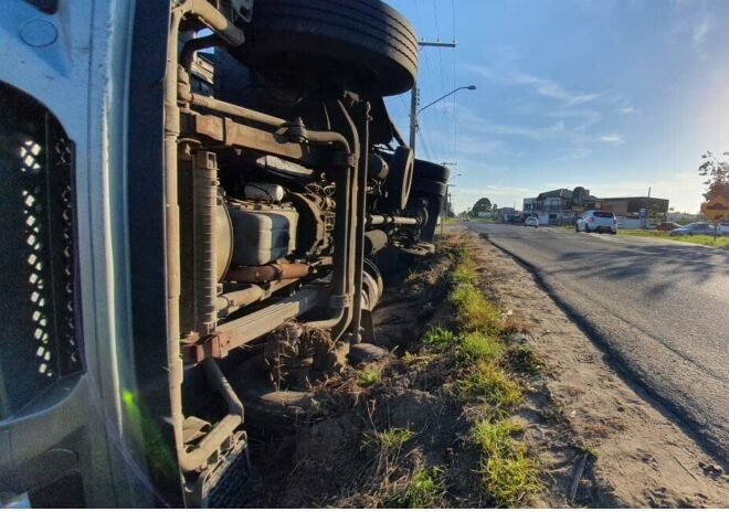 O motorista de um caminhão com placas de Itajaí, carregado de filme de fralda, tombou às margens da SC 447, na Rodovia Estadual, sentido trevo das praias, no bairro Jardim das Avenidas, em Araranguá. O acidente ocorreu pouco antes das 16 horas desta segunda-feira, dia 03.