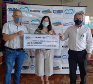 A reunião de prestação de contas aconteceu nesta terça feira 01/02 na Casa da Fraternidade. Esteve presente o Sub-Gerente do Combo Atacadista Mauricio Nazário e o sr. Cleber Giovane da Silva, representante das empresas Sepac com a Marca Duetto e da DMuller representante da empresa Selmi que produz as Massas Galo que estará até o final do mês de fevereiro em toda a rede de Supermercados Giassi e Combo atacadista em prol da instituição.
