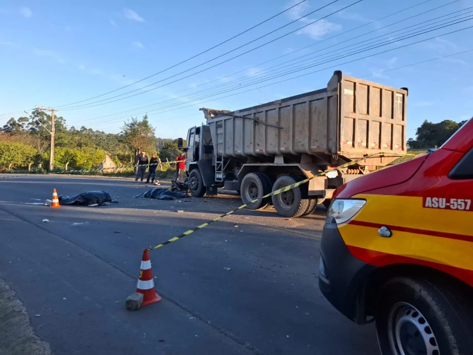Duas pessoas morreram após uma colisão frontal entre uma motocicleta e um caminhão na tarde deste sábado (6), em Sangão. O acidente foi registrado por volta das 16h13, na Rua São João Batista, no bairro Morro Grande.
