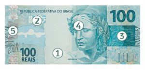 Ao segurar a nota contra a luz, é possível ver na área clara, na frente da nota, a figura do animal (tartaruga, garça, arara, mico-leão dourado, onça-pintada ou garoupa) e o valor da nota.