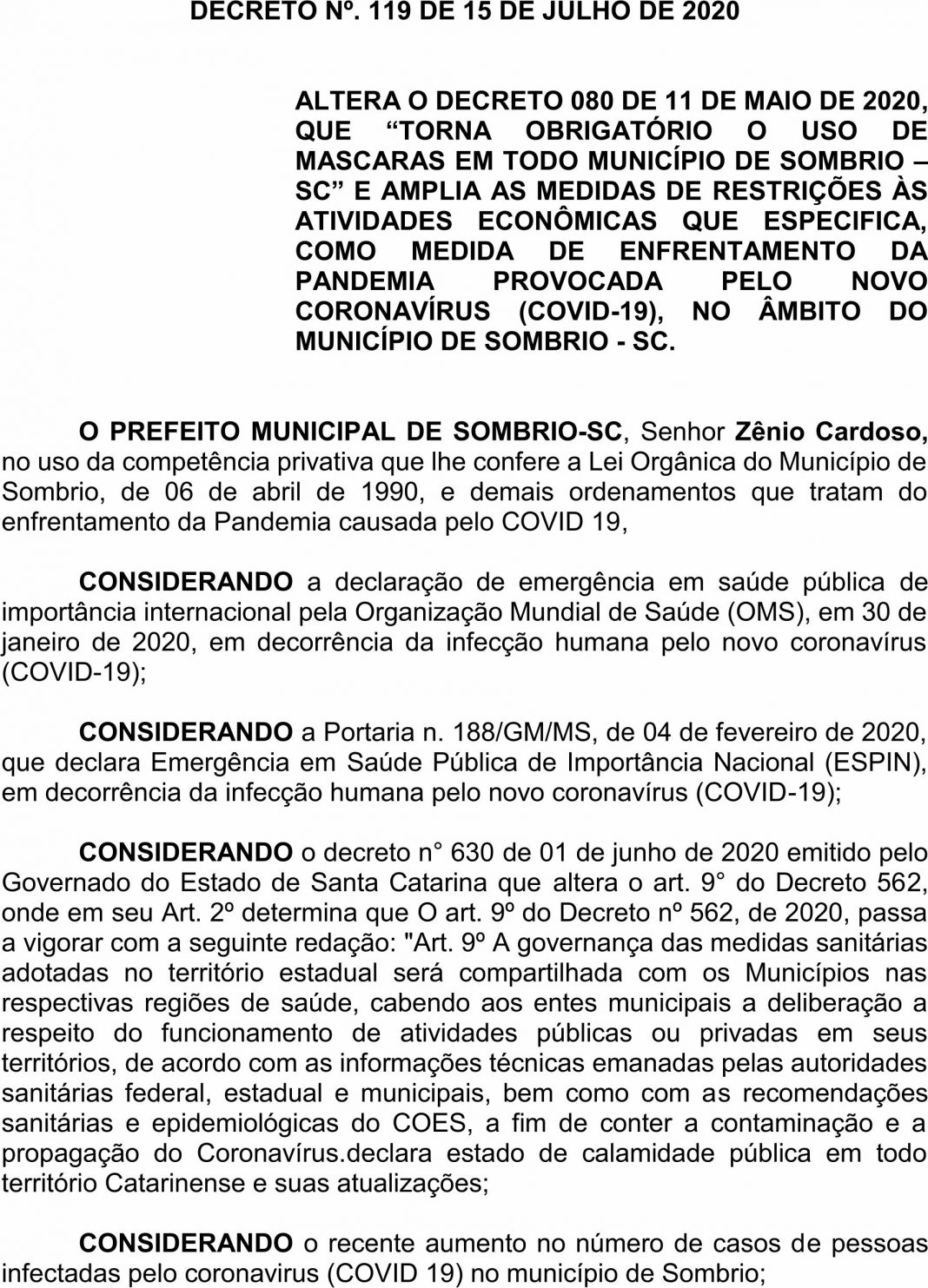Até o dia 17 de Setembro de 2020 ficam determinadas as seguintes restrições, como medida de diminuir a transmissão comunitária do COVID-19, em todo o Município de Sombrio: