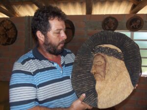 “Aprendi essa arte desde adolescente. Aos 14 anos ganhei de presente do atual prefeito, Eder Mattos um jogo de ferramentas para fazer as esculturas. Hoje vendo peças a partir de R$50 que ajudam na renda mensal”, frisa. Claudecir também gosta de tocar violão e compor música sertaneja e gospel. Até a páscoa deve sair uma moda voltada para o lado espiritual.