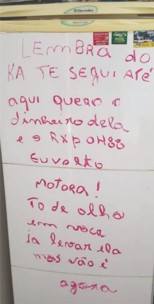 Os mesmos usando um batom vermelho para escrever na geladeira deixaram a seguinte frase: “Lembra do ka? Te segui até aqui e quero o dinheiro dela e o rxpoh88. Eu volto motora! To de olho em você. Ia levar ela mas não é agora”.