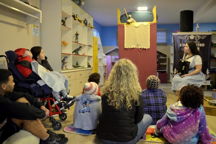 As crianças atendidas pela Casa Guido, em Criciúma, receberam nesta terça-feira (24) uma visita especial: o espetáculo de teatro de bonecos “Pulcinella e o Monstro”, apresentado de forma gratuita como parte da circulação viabilizada pela Política Nacional Aldir Blanc (PNAB). Além dos pequenos, pais, colaboradores e voluntários também se divertiram com a apresentação.