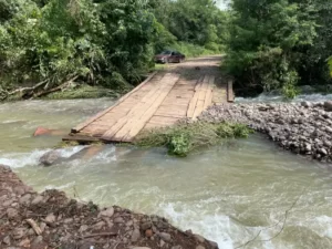 Com uma das cabeceiras afetadas, a ponte de madeira ficou parcialmente submersa nas fortes correntezas do Rio da Pedra.