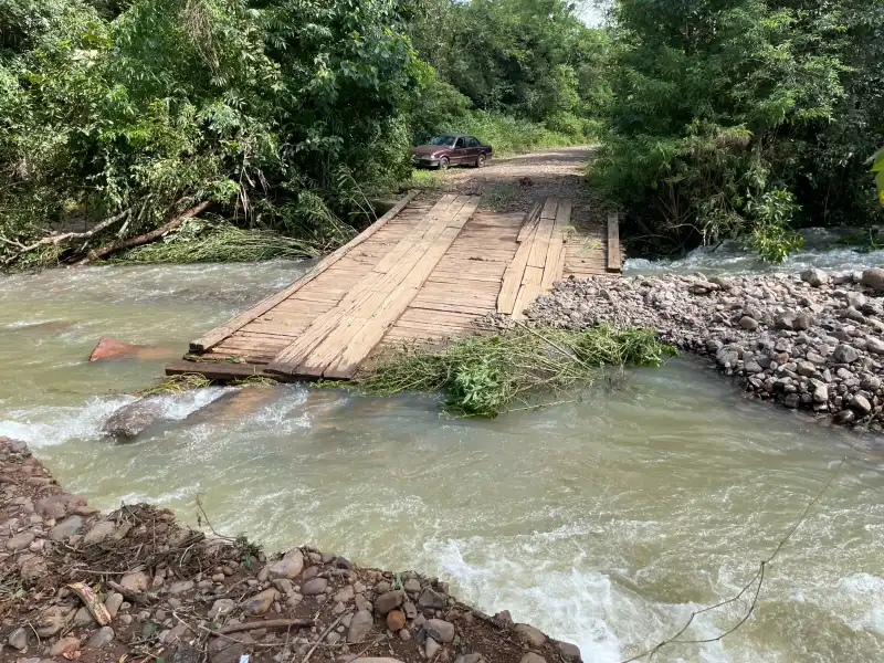 Uma ponte de madeira teve sua cabeceira destruída, enquanto o rio saiu do seu leito em outro ponto
