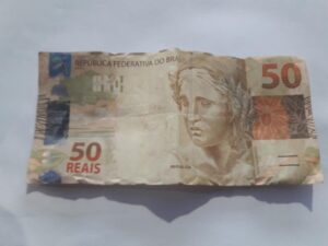 Ao verificar a sacola de dinheiro havia uma nota de R$ 50,00 cobrindo alguns papéis de jornal, simulando maços de dinheiro