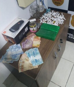 Foram apreendidos 114 petecas de cocaína embaladas e prontas para a venda, mais de R$ 1.000,00 em dinheiro, dois tabletes de maconha que pesaram 840 gramas e demais materiais para embalagem.