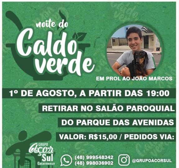 Não será de forma presencial. Mas a população de Sombrio e região poderá adquirir e se deliciar com a “Noite do Caldo verde em suas casas”. A arrecadação terá um destino especial, será doado para auxiliar no tratamento de saúde do adolescente João Marcos de Santa Rosa do Sul, que foi vítima de uma descarga elétrica.