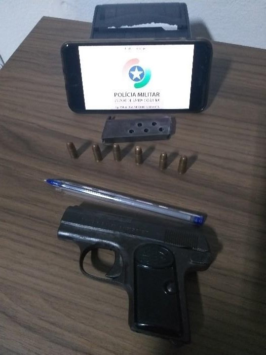 A PM iniciou buscas, quando avistou o veículo, o condutor tentou desviar acessando outra rua, mas acabou parando o carro assim que recebeu ordem de parada dos policiais. Em buscas feitas no interior do veículo foi encontrado embaixo do banco do motorista uma pistola com seis munições. O homem disse a PM que não tem o porte, nem posse e que usa a arma para defesa pessoal e familiar.