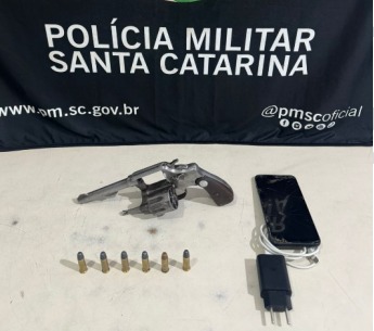 Durante a revista pessoal e a verificação da bag de entregas acoplada à motocicleta, os policiais localizaram um revólver calibre .32 com a numeração suprimida. A arma estava municiada com seis cartuchos do mesmo calibre.