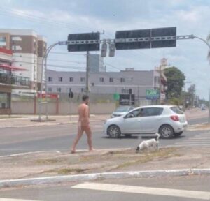 Em meio a temperaturas acima de 30ºC, um homem foi flagrando andando pelado, ao lado de um cachorro, na Avenida Centenário, em Criciúma, uma das mais movimentadas da cidade.