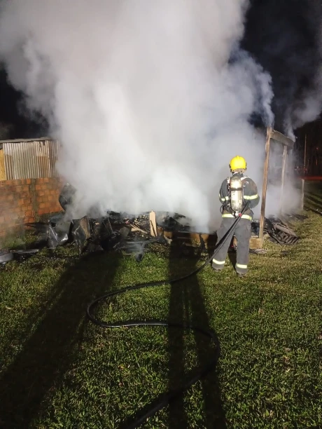 Na noite desta terça-feira (12), um incêndio destruiu uma residência de madeira na Rua Três Marias, bairro Vila Ribeiro, em Passo de Torres. O Corpo de Bombeiros foi acionado por volta das 23h26 e, ao chegar, encontrou a edificação já tomada pelas chamas.