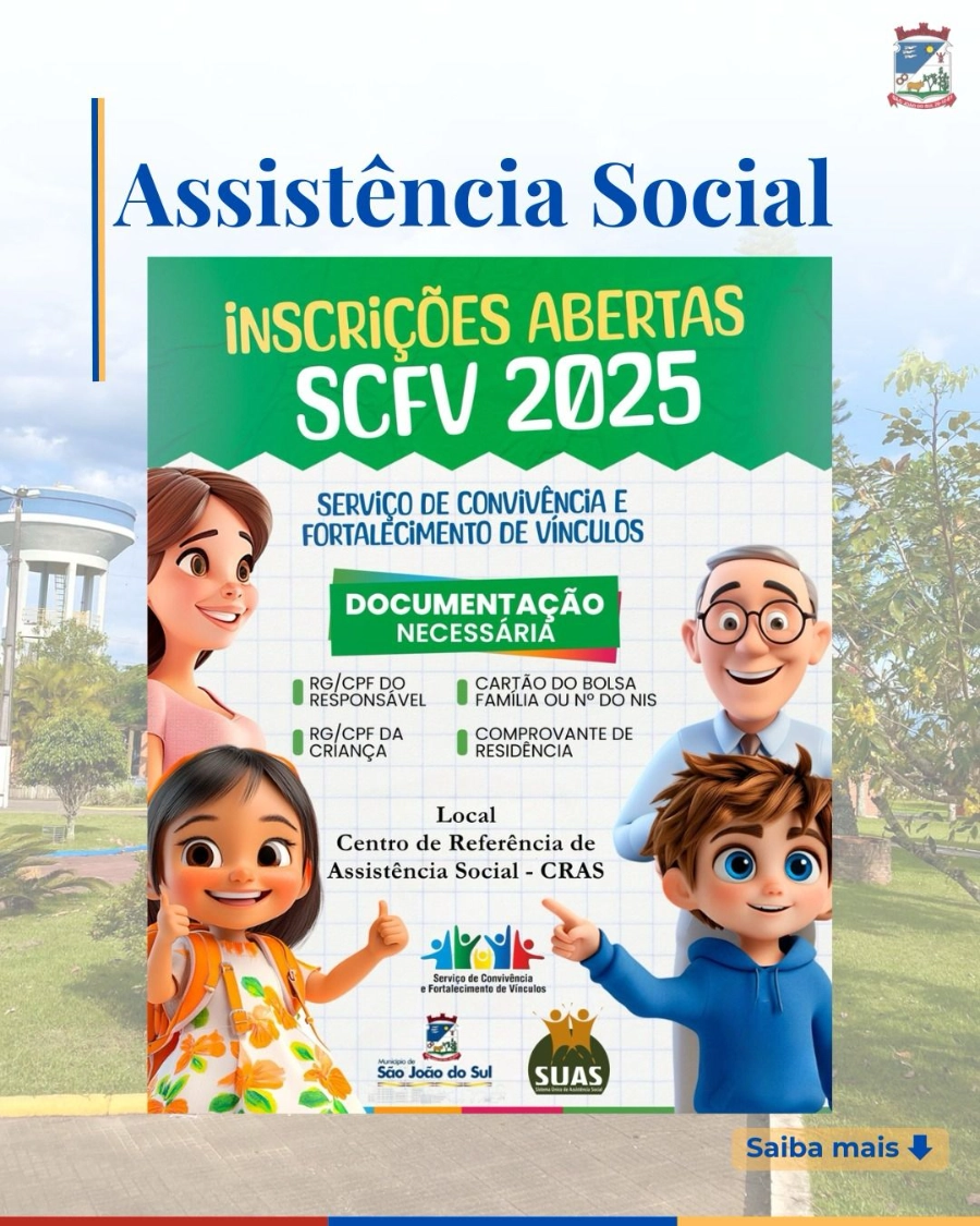 A Prefeitura Municipal de São João do Sul, por meio da Secretaria Municipal de Assistência Social, informa que estão abertas as inscrições para o Serviço de Convivência e Fortalecimento de Vínculos, destinado a crianças e adolescentes.