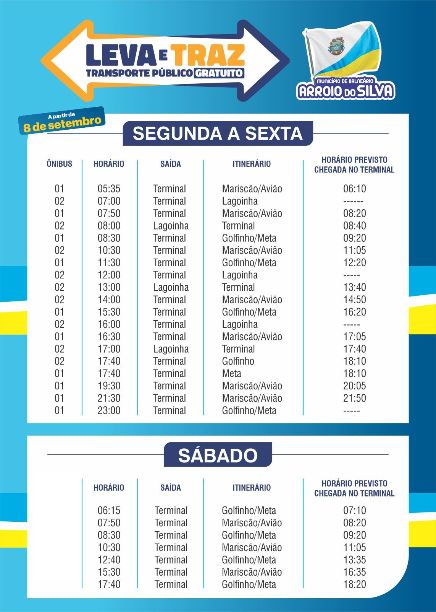 A Prefeitura de Balneário Arroio do Silva anunciou o início da operação do transporte público gratuito “Leva e Traz”, que passará a circular a partir do dia 8 de setembro. O serviço tem como objetivo ampliar a mobilidade urbana e oferecer acesso a comunidades que não eram contempladas pelo transporte coletivo.
