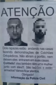 “Atenção estão andando nas casas 2 rapazes fazendo demonstrações de colchões ortopédicos. Não abram o portão pra eles e nem os deixam entrar em sua casa. Cuidado eles tb tem uma mulher junto com eles!!! São ladroes e estão armados! Passe esta mensagem pra todas as pessoas que você conhece vamos ficar atentos.”, alerta a postagem.