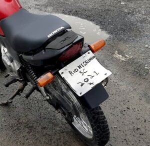 Policiais rodoviários federais flagraram manhã de sábado (13), na BR 280 em Rio Negrinho uma motocicleta Honda/CG com a placa pintada à mão.