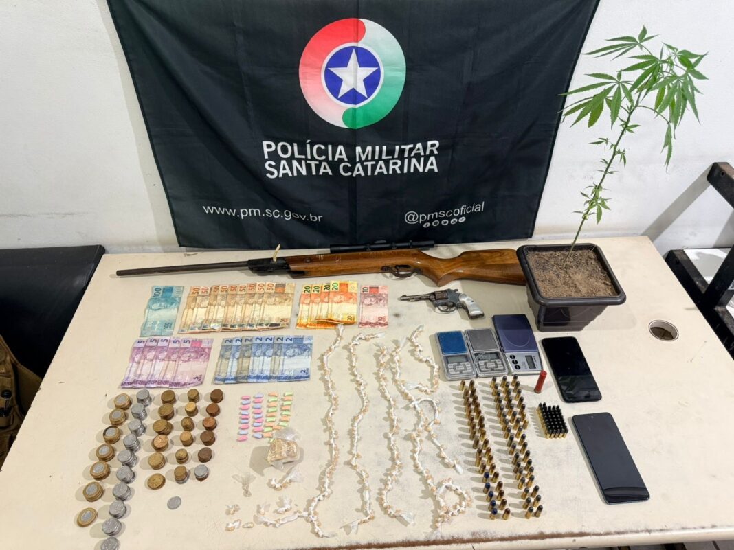Também foram recolhidas munições de diferentes calibres, armas de fogo, balanças de precisão e uma quantia em dinheiro. Todo o material foi encaminhado para os procedimentos legais cabíveis.