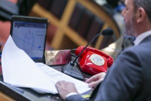 Ao fazer a leitura da representação contra o governador na manhã de quinta-feira, o deputado Laércio Schuster ao lado do telefone vermelho que se tornou símbolo de ironia entre a comunicação do governo com deputados. O aparelho está na Alesc desde maio, quando governador ofereceu um canal, por telefone, para diálogo com o legislativo.