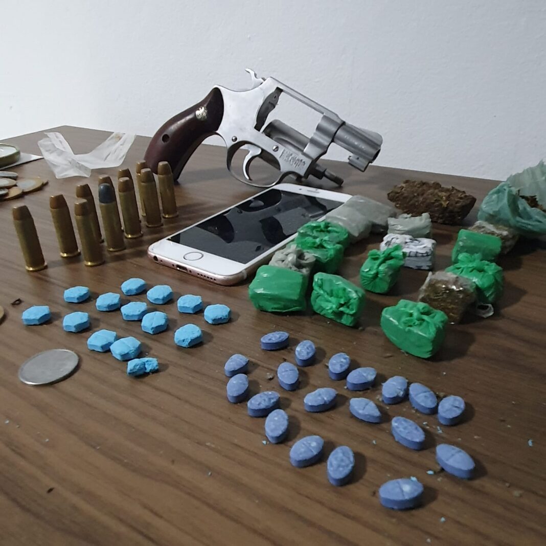 A Polícia Militar pediu apoio a outra viatura que seguiu para o endereço, entre elas uma viatura da Polícia Civil. Quando a PM chegou no local foi encontrado um homem com um revólver na cintura e uma pochete na mão. Ele pulou a janela e iniciou fuga pulando um muro e se escondeu na residência de uma vizinha. O mesmo foi detido pelos policiais e embaixo de um carro foi encontrado o revólver 38, 11 munições intactas e também droga.
