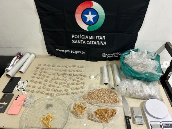 Durante as buscas no local, os policiais apreenderam 578,11 gramas de crack, 5 gramas de cocaína, três celulares, uma faca utilizada para cortar a droga, além de plástico filme e lâminas de gilete usados no preparo e embalagem dos entorpecentes.