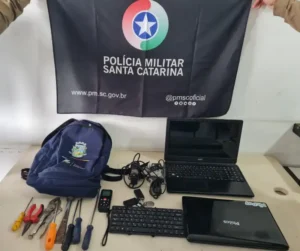 A PM encontrou uma mochila contendo dois notebooks, ferramentas, uma trena a laser, um teclado e um pen-drive no local informado como esconderijo. A vítima reconheceu os objetos.