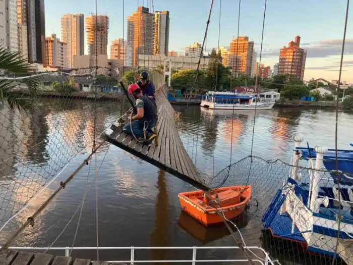 Foi desmontada na sexta-feira (24) parte da estrutura da ponte pênsil que caiu e causou a morte um jovem na madrugada de segunda-feira (20), no município de Passo de Torres, Sul catarinense. A ponte faz divisa com o Rio Grande do Sul.