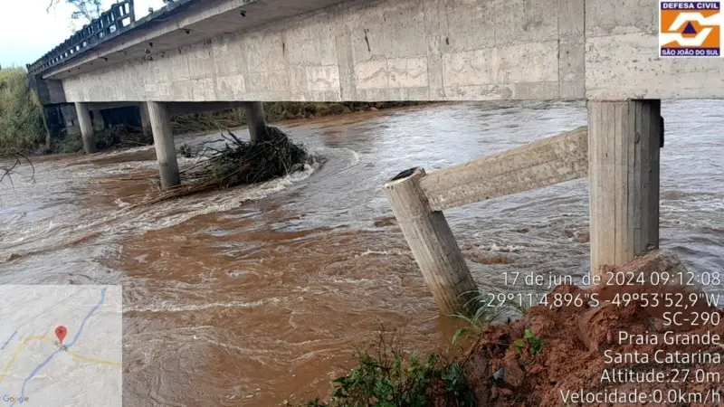 A ponte sobre o rio Canoas, que conecta os municípios de São João do Sul e Praia Grande, na SC-290, foi interditada mais uma vez nesta quarta-feira, dia 9, após o deslocamento de um dos pilares de sustentação. Segundo Alisson Silva, coordenador regional de infraestrutura, a interdição foi necessária após as recentes chuvas elevarem o nível do rio e comprometerem a estrutura.