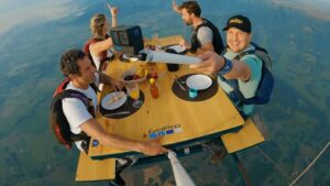 Esse sonho se tornou realidade, o projeto “Café da Manhã nas Alturas” aconteceu e encantou a todos. Uma mesa de piquenique foi pendurada na cesta de um balão que sobrevoou Praia Grande com as quatro pessoas sentadas, tomando café e curtindo a paisagem. Logo em seguida os mesmos pularam de uma altura de aproximadamente 3500 metros e resultou em uma experiência incrível vivida e contada por eles.