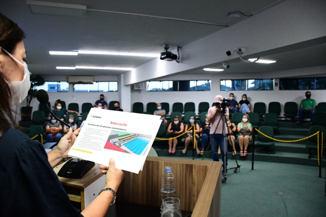Gislaine mostrou algumas das ações de 2021, mas focou principalmente no que tem por vir em 2022, com slides na TV dentro do plenário e material impresso a disposição dos vereadores.