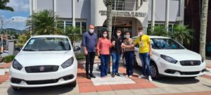 Na manhã desta terça-feira (28), em frente ao Paço Municipal, a Prefeita de Sombrio, Gislaine Cunha, recebeu e repassou às chaves de dois Fiats Grand Siena, para a Secretaria Municipal de Saúde, representada pelos diretores Valdinéia Pedroso, Cleiton Daboit e o diretor do Transporte Fora do Domicílio, Vinícius Barreto.