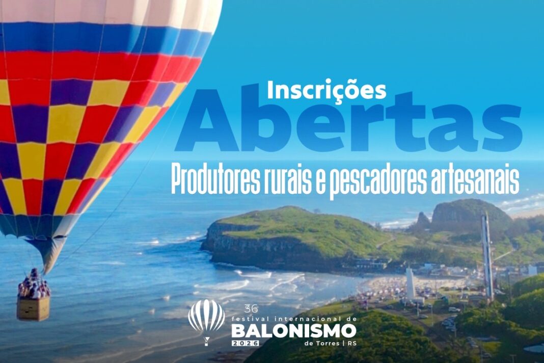 Estão abertas as inscrições para produtores rurais e pescadores artesanais interessados em expor e vender seus produtos durante o 36º Festival Internacional de Balonismo, que será realizado em 2026 em Torres. O prazo segue até o dia 9 de abril, e o credenciamento deve ser feito presencialmente na Secretaria de Desenvolvimento Rural e Pesca, mediante apresentação da documentação exigida.