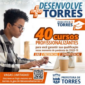A Prefeitura de Torres, através da Secretaria Municipal de Trabalho, Indústria e Comércio, com parceria de entidades de ensino da cidade, vai disponibilizar 40 cursos profissionalizantes. São aulas que serão inicialmente oferecidas na plataforma EAD-Ensino a Distância e com o término da pandemia, também nos formatos presencial e semi. Todos os cursos terão certificados do MEC.