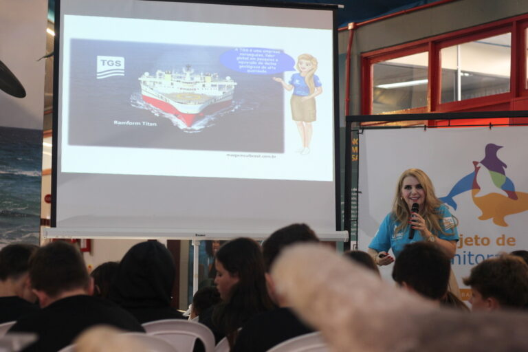 Durante a atividade, os alunos conheceram o funcionamento do Projeto de Monitoramento de Praias da Bacia de Pelotas (PMP-BP) e compreenderam como é realizado o acompanhamento da fauna marinha ao longo do litoral. A apresentação ocorreu de forma interativa, despertando o interesse das crianças pelo ecossistema marinho e pelos desafios da conservação ambiental.